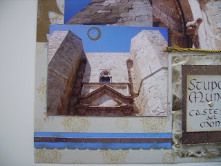La pagina è dedicata ad una delle mie grandi passioni: Federico II, e in particolare alcune foto di Castel del Monte, fatte nell'estate 2008, durante una bellissima vacanza a Bari e provincia; ho cercato di dare un tono molto "medievale": le scritte sono realizzate a mano con penna calligrafica, e applicate su un ritaglio di patterned paper Once upon a time, della DCWV, applicato su un ritaglio di carta pergamena, accartocciata e sporcata con distress ink e acrilico color bronzo.
